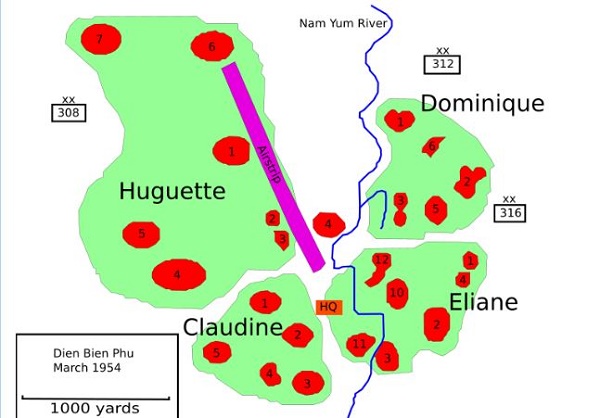 Bản đồ vị trí trung tâm của quân Pháp trong trận Điện Biên Phủ, tháng 3 năm 1954. Ảnh https://vi.m.wikipedia.org/
