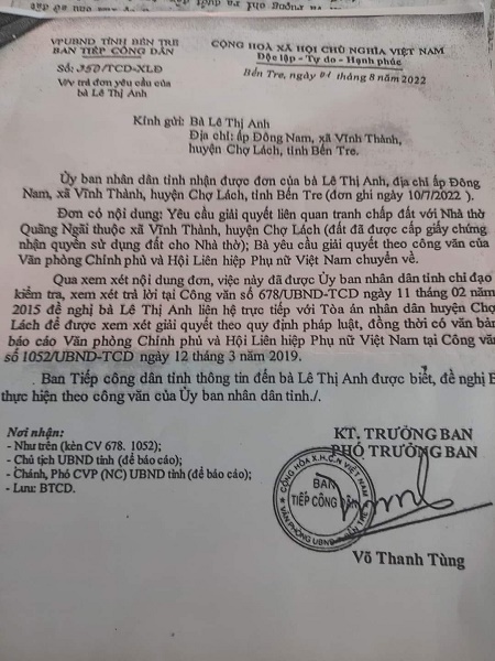 Không thương lượng được với nhà thờ tôi đã viết đơn xin tranh chấp đất gởi đến ủy ban nhân dân xã Vĩnh Thạnh.
